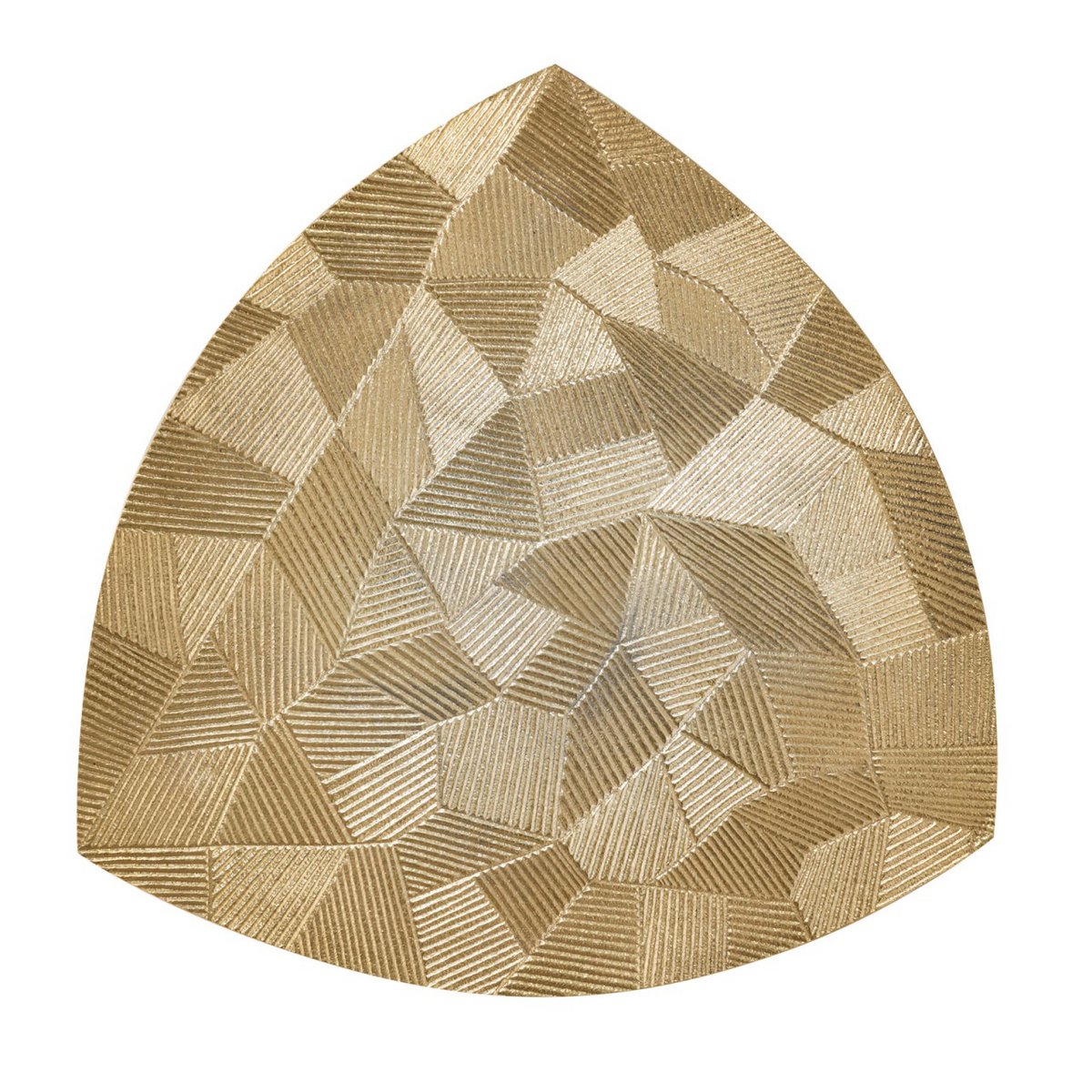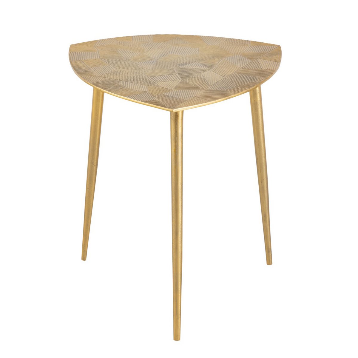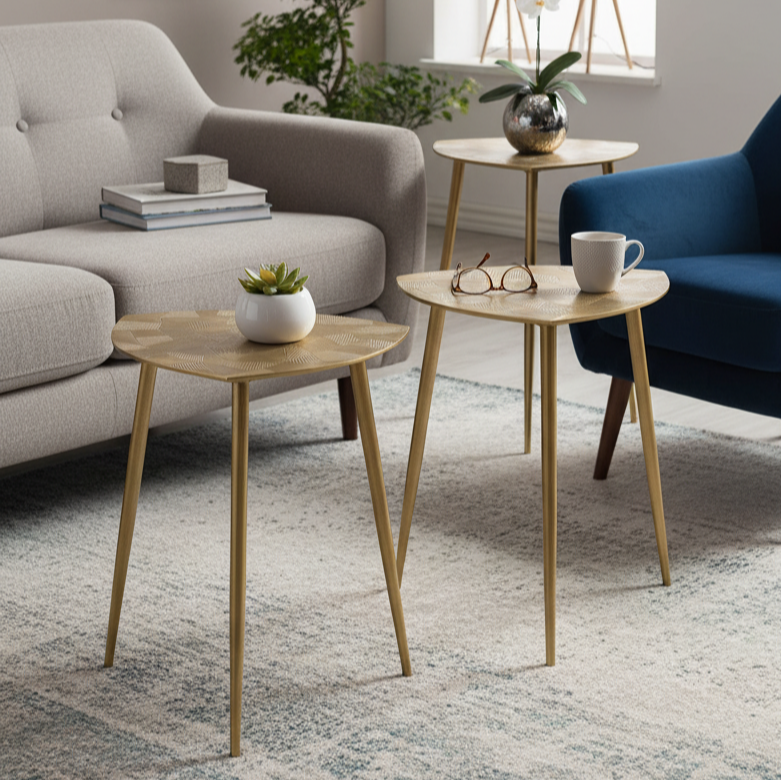 Stel je voor dat deze prachtige tafel je woonkamer siert, versierd met weelderige bloemen, delicate schelpen of elegante kaarsen. Het charmante driehoekige ontwerp dient niet alleen als een praktisch oppervlak voor je essentials – of het nu je favoriete boek of een warme kop thee is – maar betovert ook met zijn authentieke textuur en verleidelijke afwerking. Verkrijgbaar in zowel glinsterend zilver als luxueus goud, past hij bij elk interieur en blaast hij leven in je huis.